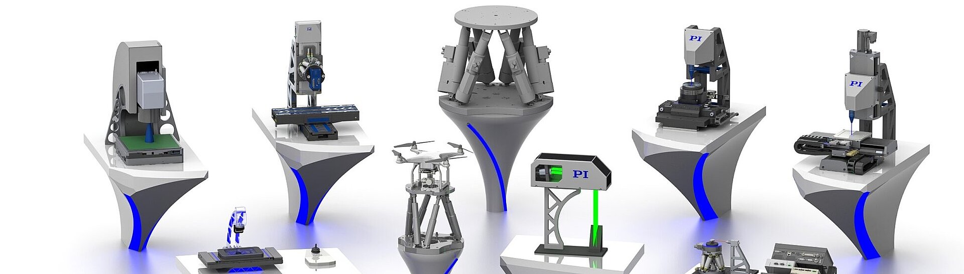 每个市场和每个应用对定位解决方案在精度、动态、行程、控制或软件方面的要求有所不同。凭借广泛的技术和产品组合,PI可以灵活地响应个性化需求,提供从单个组件到多轴系统组件的组合解决方案。本页面展示了针对特定应用的不同展示品示例,我们可以根据您的特定需求进行配置和组装。
