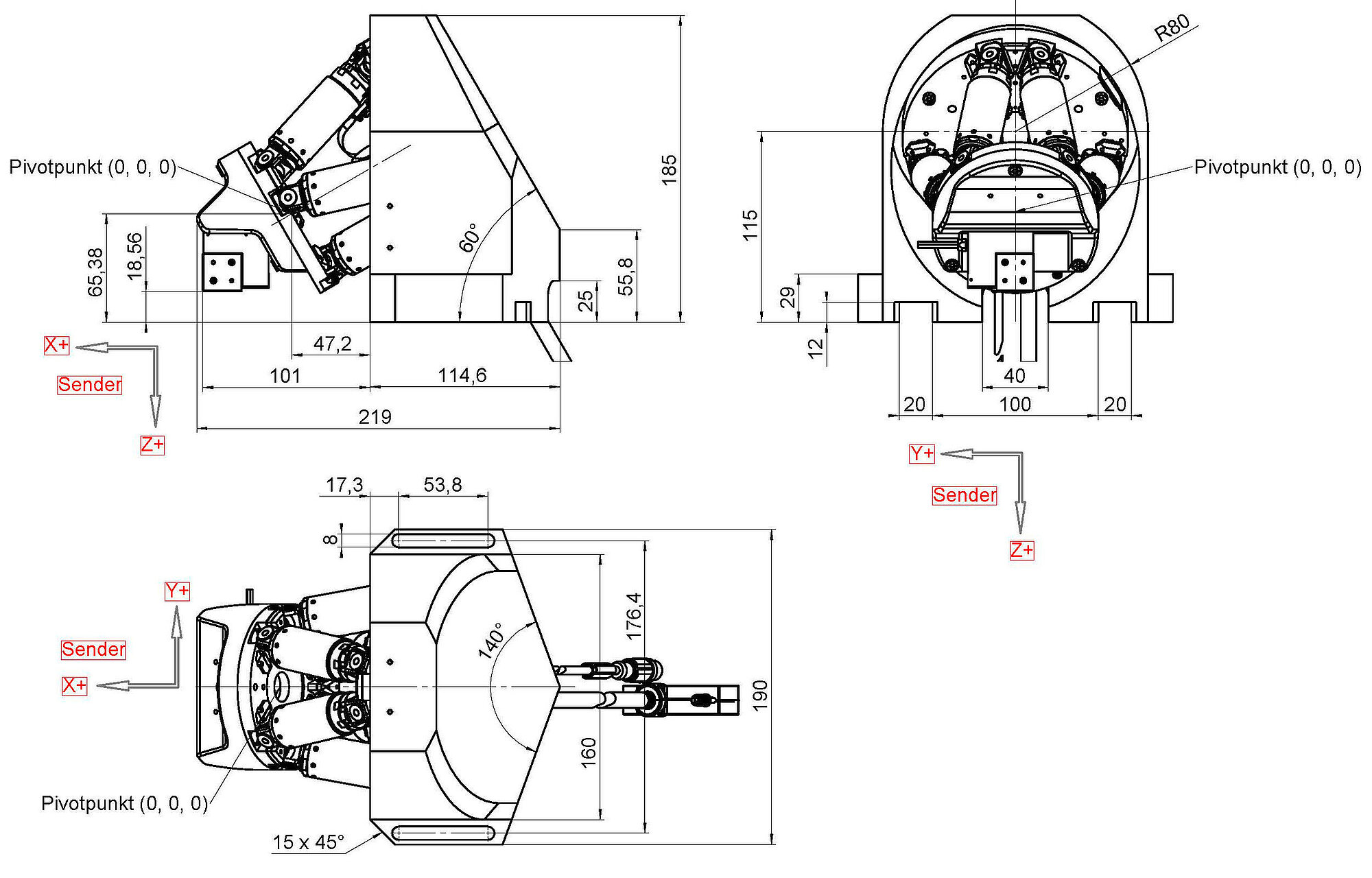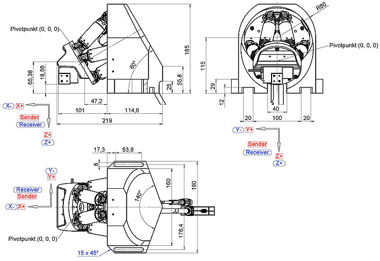 The maximum travel ranges of the individual coordinates (X, Y, Z, θX, θY, θZ) are interdependent. The data for each axis shows its maximum travel range when all other axes are in the zero position of the nominal travel range and the default coordinate system is in use, or rather when the pivot point is set to 0,0,0.