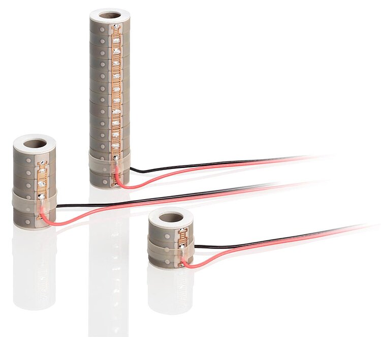 PICMA® Stack multilayer ring actuator; PICMA® piezo actuator drive; 11 µm travel range (open loop); 8 mm × 4.4 mm × 16 mm (OD × ID × L); 825 N feed force; vacuum-compatible to 10-9 hPa; connecting wires, PTFE-insulated, AWG 30, Ø 0.61 mm; cable length 0.1 m