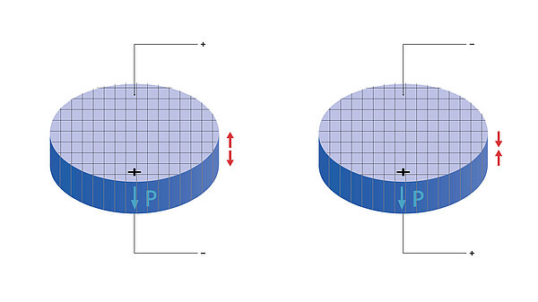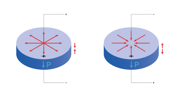 作为促动器使用时,压电陶瓷片会在施加电压时产生机械位移。 该位移可表现为直流电作用下的静态变形,或交流电作用下的振荡(例如在超声波频段)。 根据压电元件设计的不同,运动可沿纵向或径向发生。 偏转幅度由压电陶瓷片的尺寸和所施加电压共同决定。