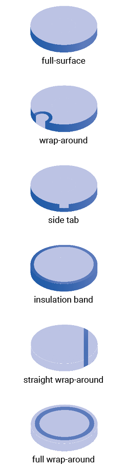 | 电极设计 | 多种设计可选:全表面电极、环绕式电极、侧边焊片电极、绝缘带电极、直绕式电极、全环绕式电极(参见右栏) |