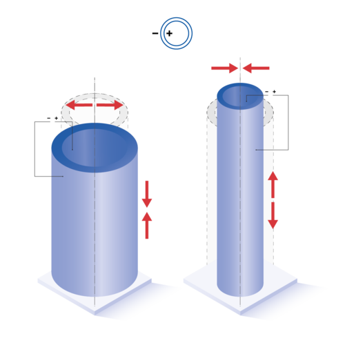 当压电陶瓷管用作促动器时,施加电压会引起机械形变。 这种形变可表现为直流电压驱动的静态变形,或交流电压驱动的振荡运动(如超声波频段)。 根据压电元件的设计差异,运动模式可分为轴向或横向。 形变幅度同时受压电管尺寸和施加电压值的影响。